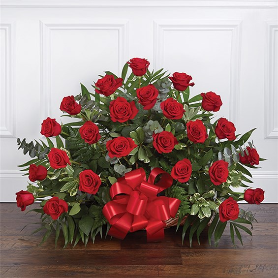 Send a message of sympathy, love and hope with this basket of red roses.• Our florists create this special sympathy arrangement in a fireside basket with two dozen premium long-stem roses• Accented with crisp greenery• Usually sent by family members, friends or business associates• Delivered directly to the funeral home• Due to the urgency of the occasion, our florists use only the freshest flowers available so varieties and colors may vary• Measures approximately 28”H x 30”W